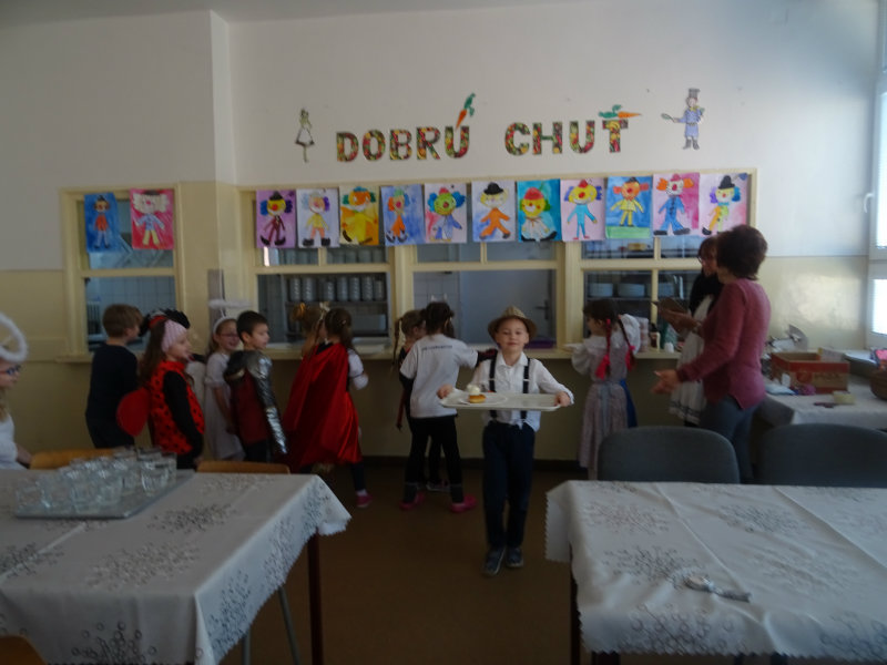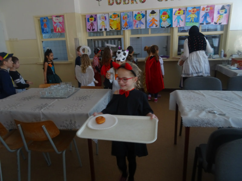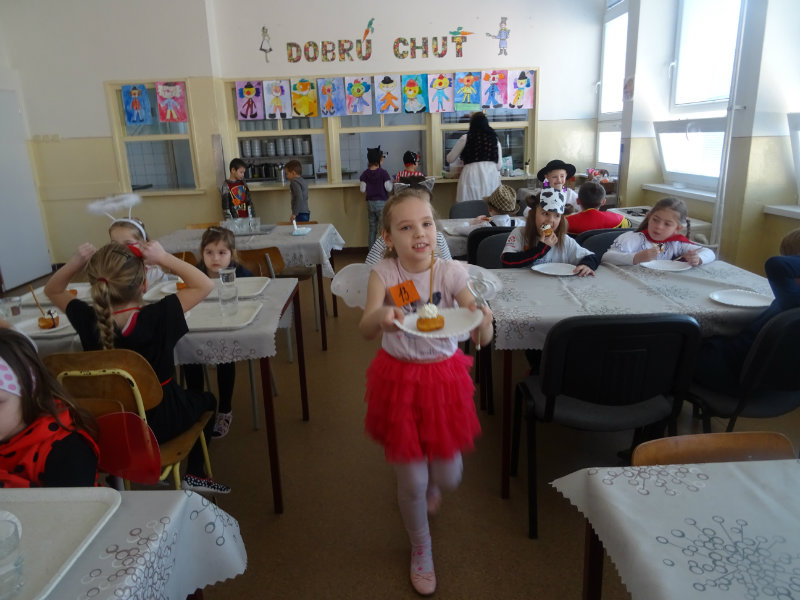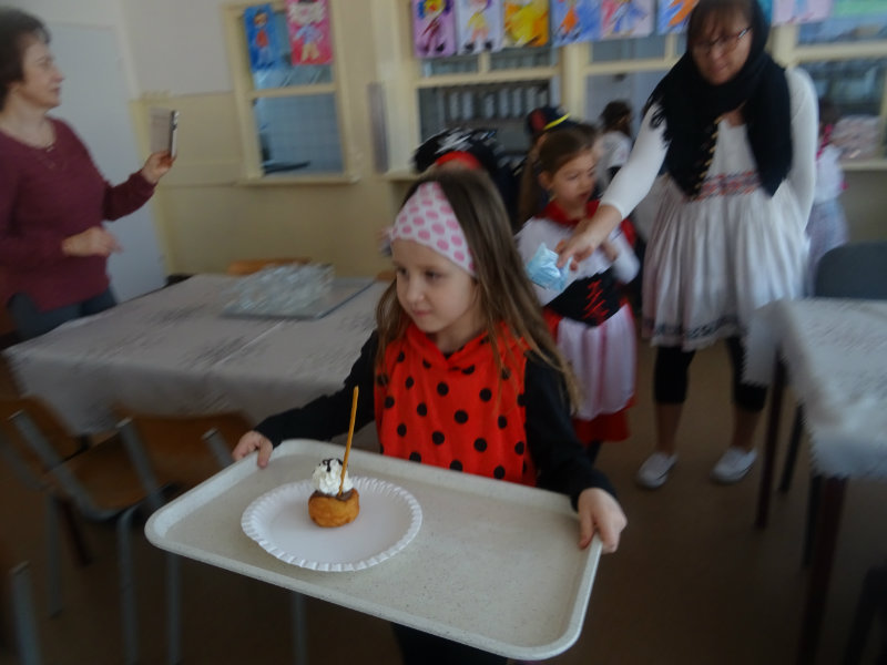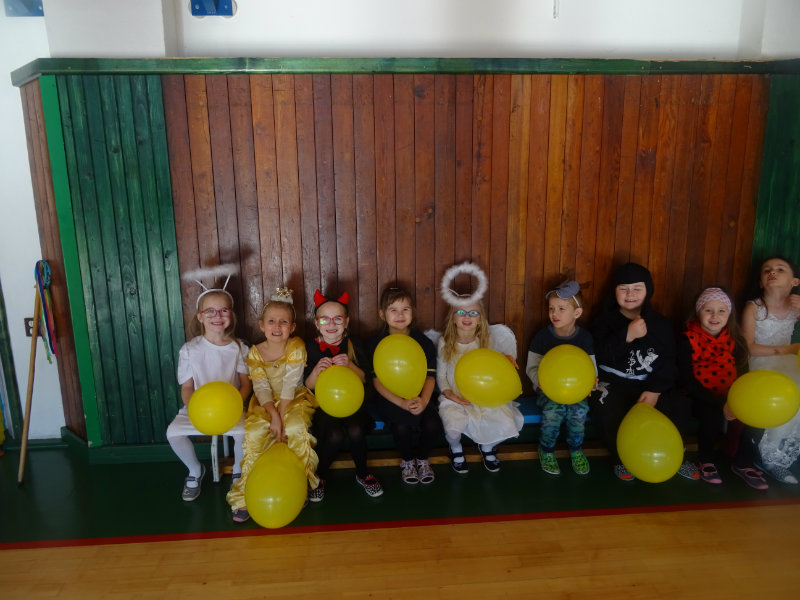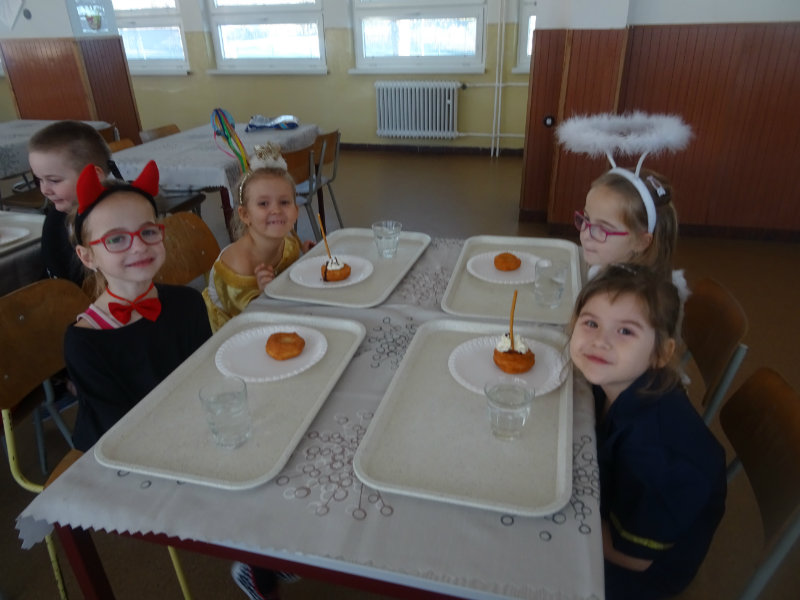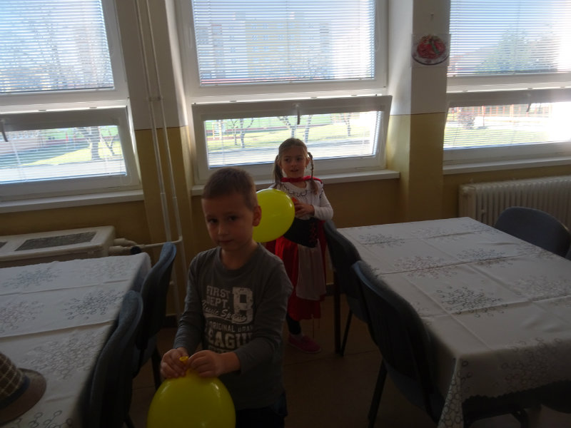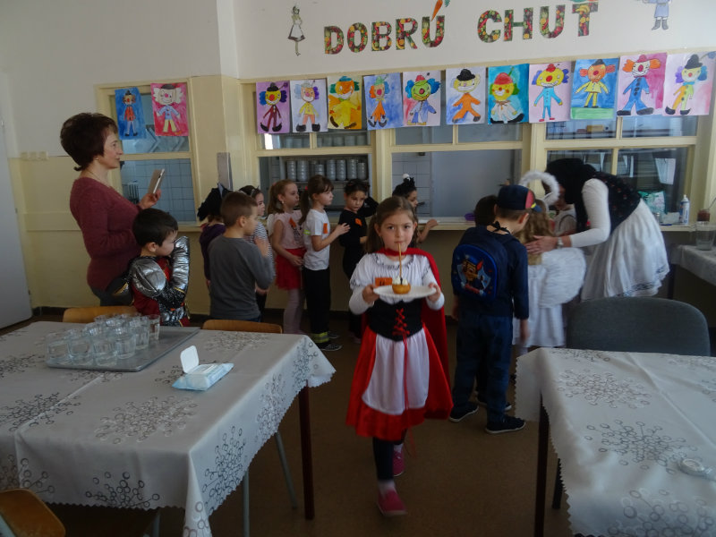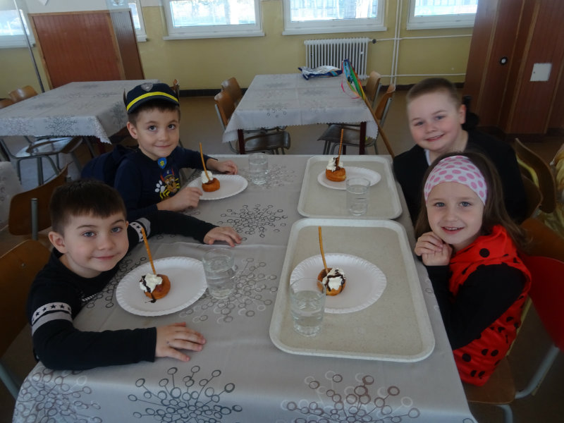 Vo štvrtok, 20.februára, nás pozvali naši kamaráti zo ZŠ na karneval. Pripravili si pre nás fašiangové prekvapenie - šišky s džemom alebo nutellou so šľahačkou a čokoládovým topingom. TO BOLA MŃAMKA! My sme pre nich vďaka tete Antalovej priniesli balóny. Súťažili sme, kto si svoj balónik dokáže sám nafúkať. Keď sme sa posilnili, presunuli sme sa do telocvične. To bolo priestoru na tancovanie! Zabavili sme sa, zatancovali, zasúťažili, bolo to veľmi príjemné stretnutie. Ďakujeme pani učiteľke Kotrasovej za krásne dopoludnie.