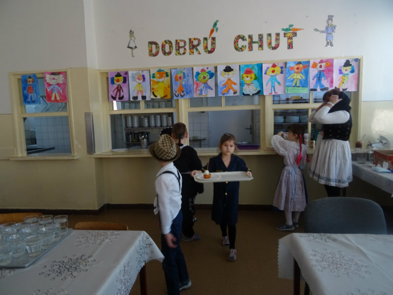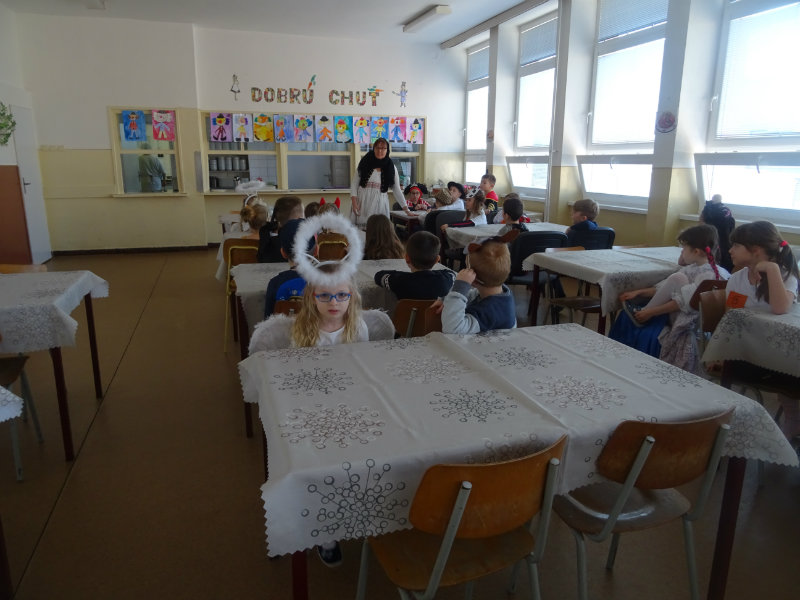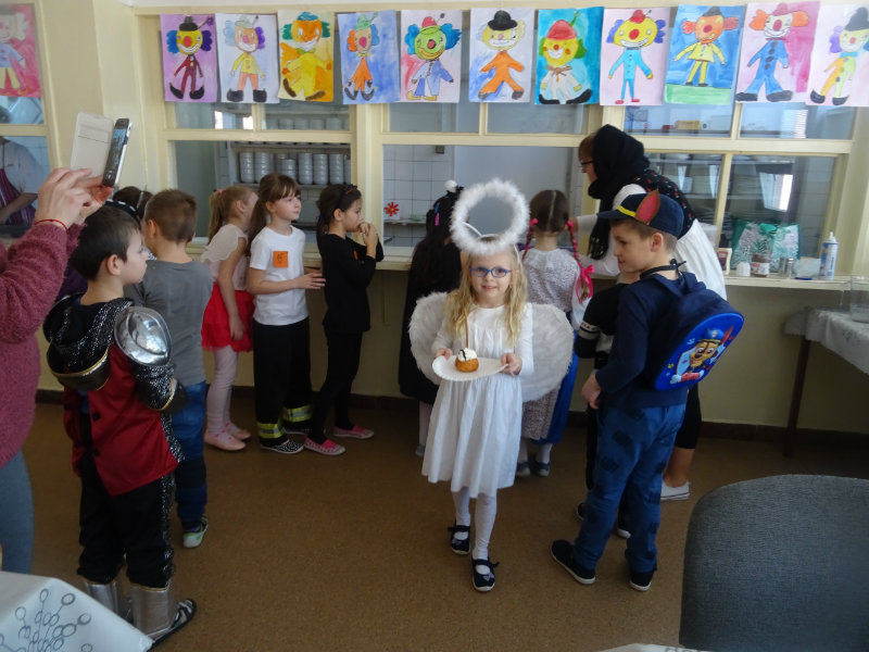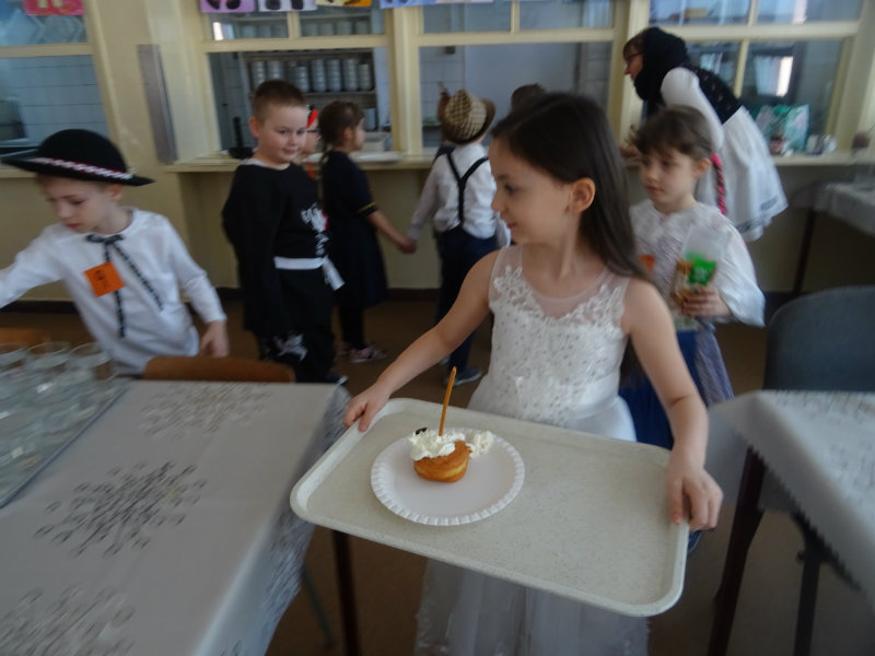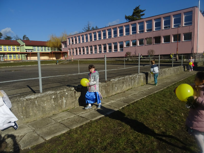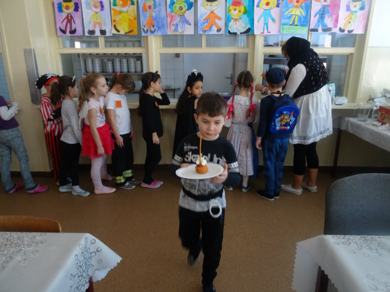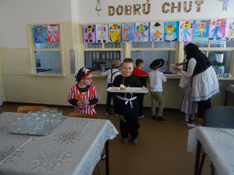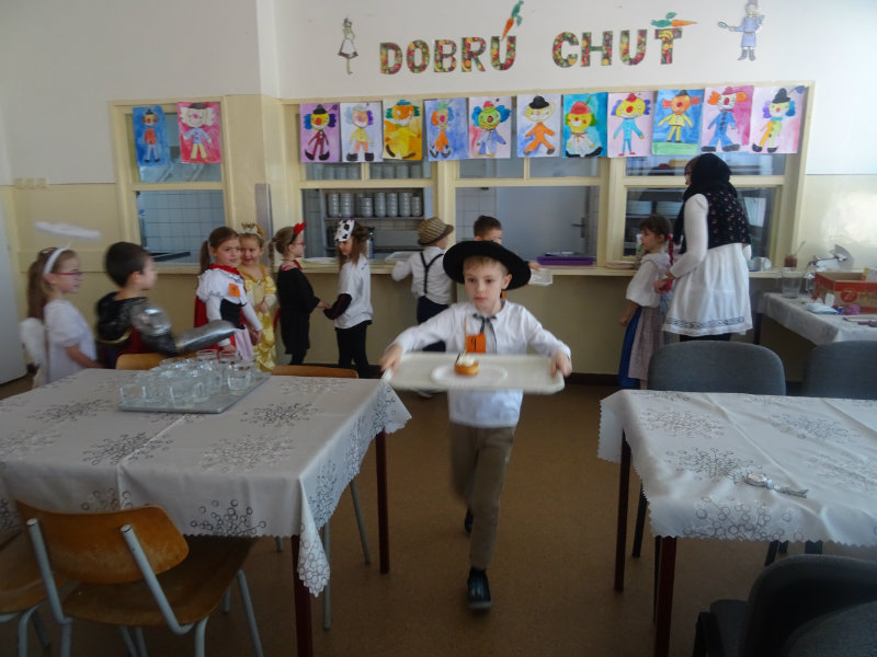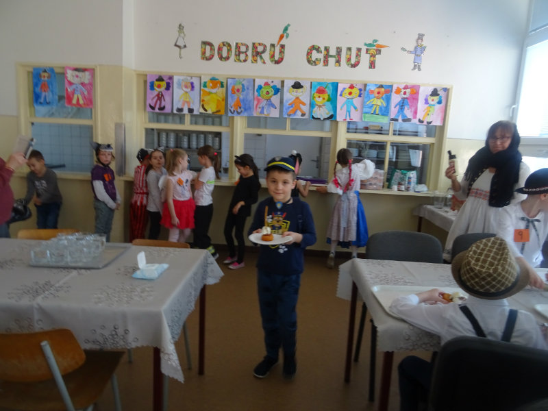 Vo štvrtok, 20.februára, nás pozvali naši kamaráti zo ZŠ na karneval. Pripravili si pre nás fašiangové prekvapenie - šišky s džemom alebo nutellou so šľahačkou a čokoládovým topingom. TO BOLA MŃAMKA! My sme pre nich vďaka tete Antalovej priniesli balóny. Súťažili sme, kto si svoj balónik dokáže sám nafúkať. Keď sme sa posilnili, presunuli sme sa do telocvične. To bolo priestoru na tancovanie! Zabavili sme sa, zatancovali, zasúťažili, bolo to veľmi príjemné stretnutie. Ďakujeme pani učiteľke Kotrasovej za krásne dopoludnie.