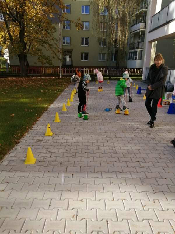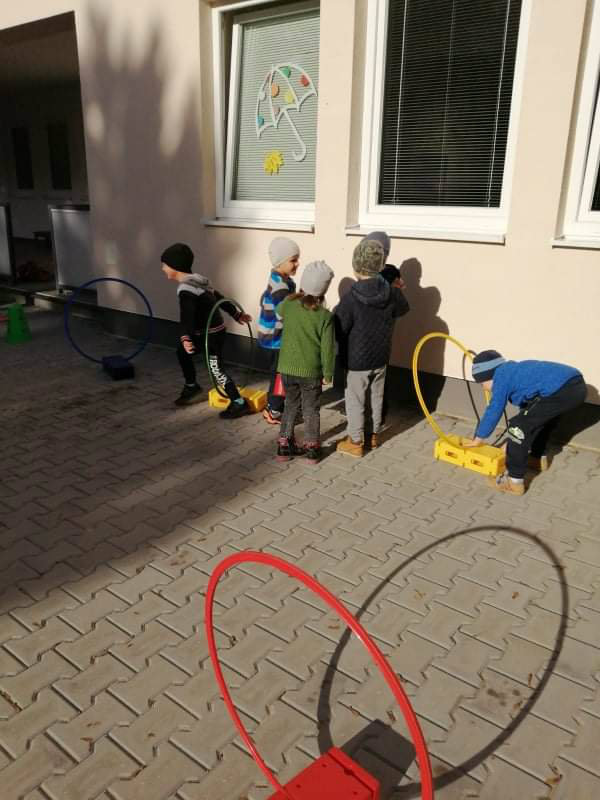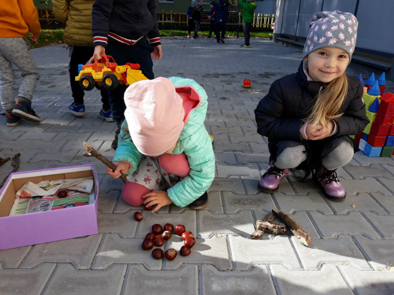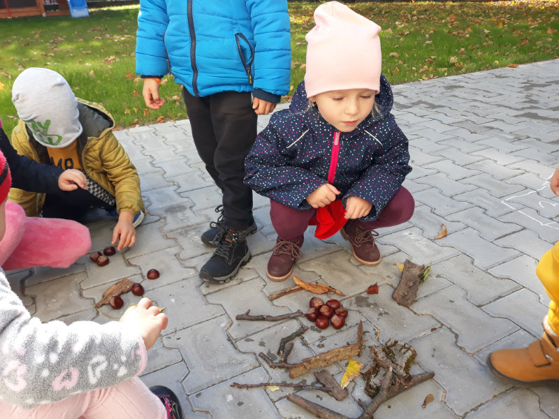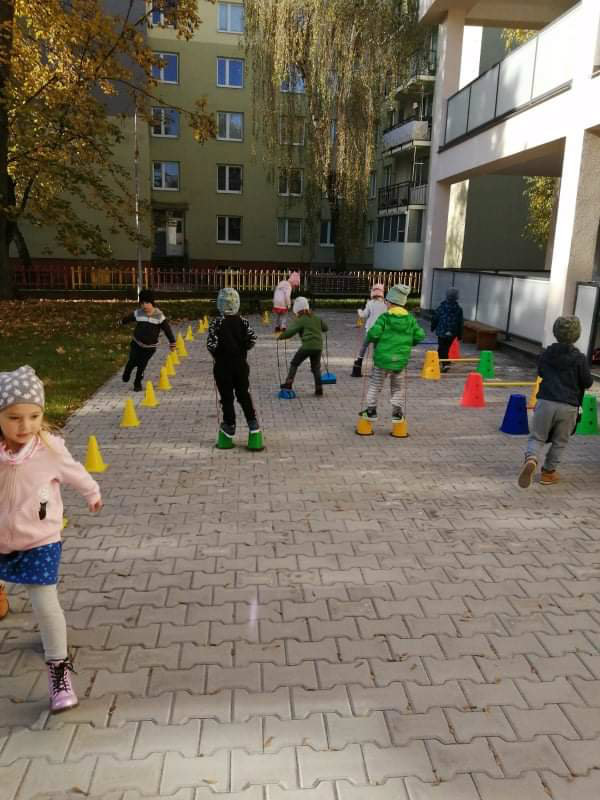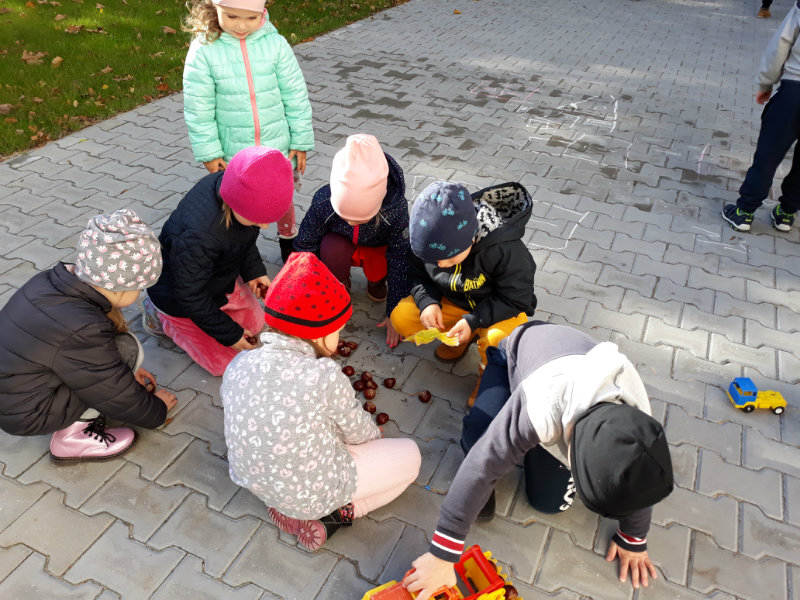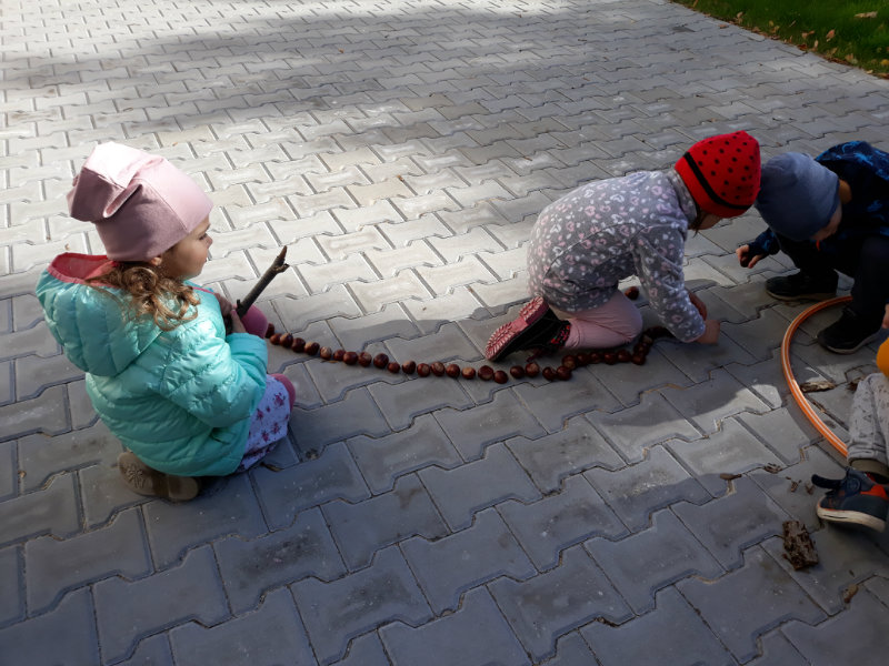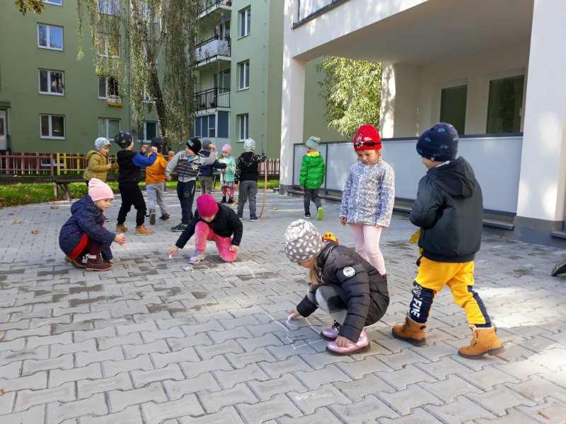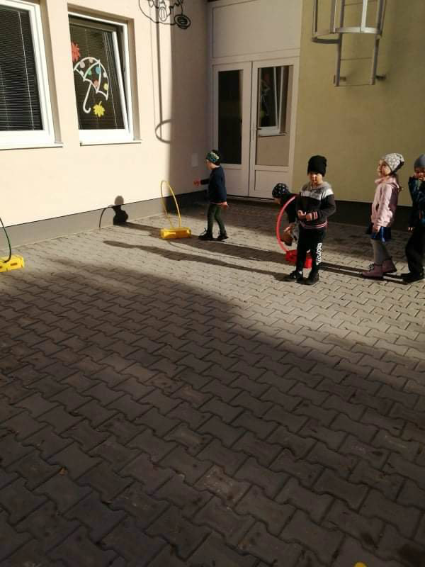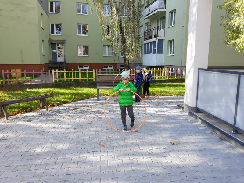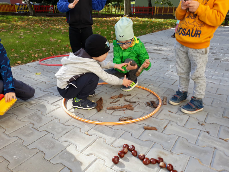 Po dažďových studených dňoch deti využili krásne jesenné počasie na školskom dvore, kde mali možnosť tvoriť rôzne obrazce z prírodnín ("na záver sme si opekali..."), športovo sa vyžili, utužovali svoje zdravie, odvážne preliezali i súťažili.