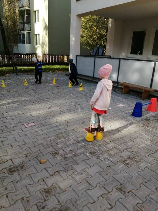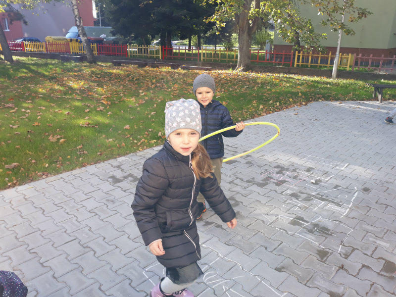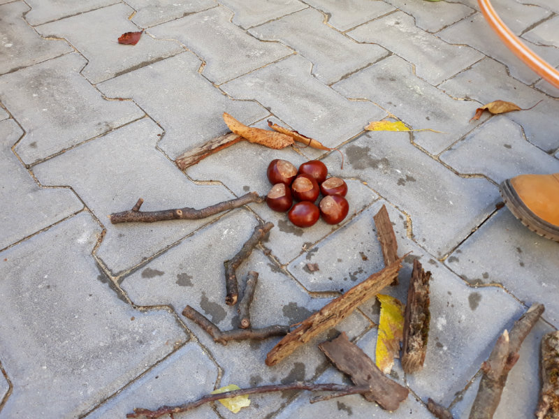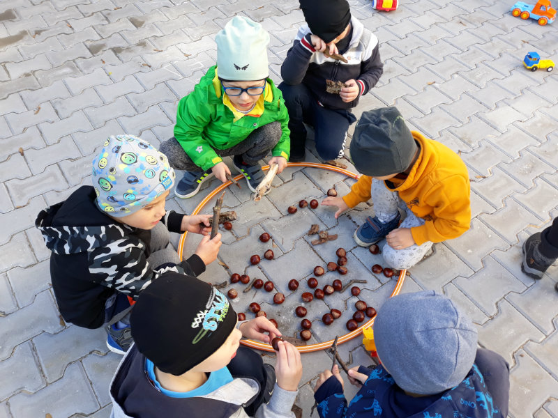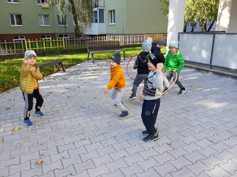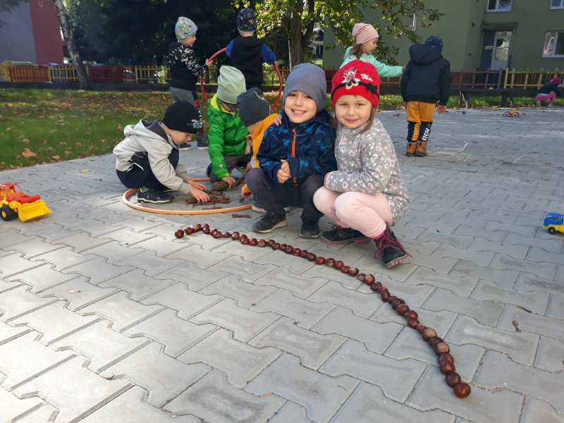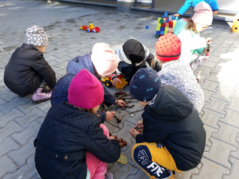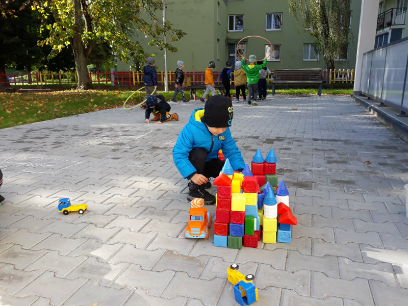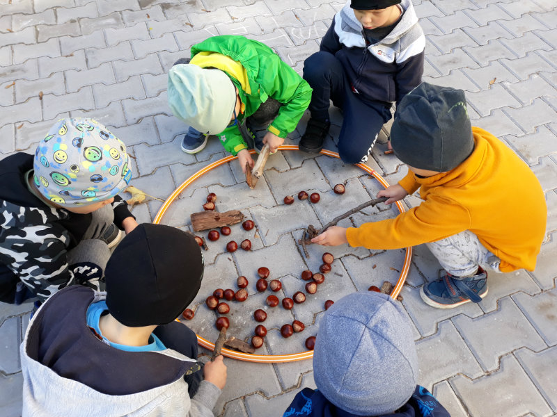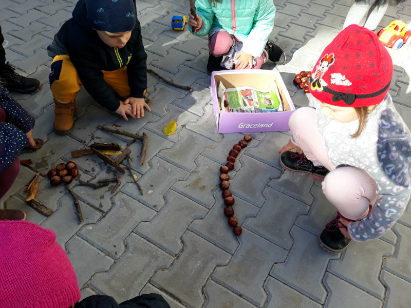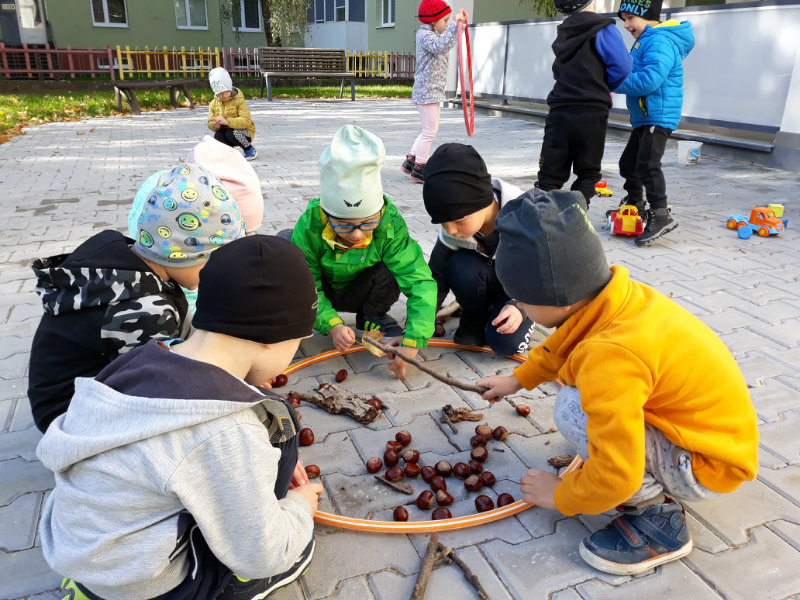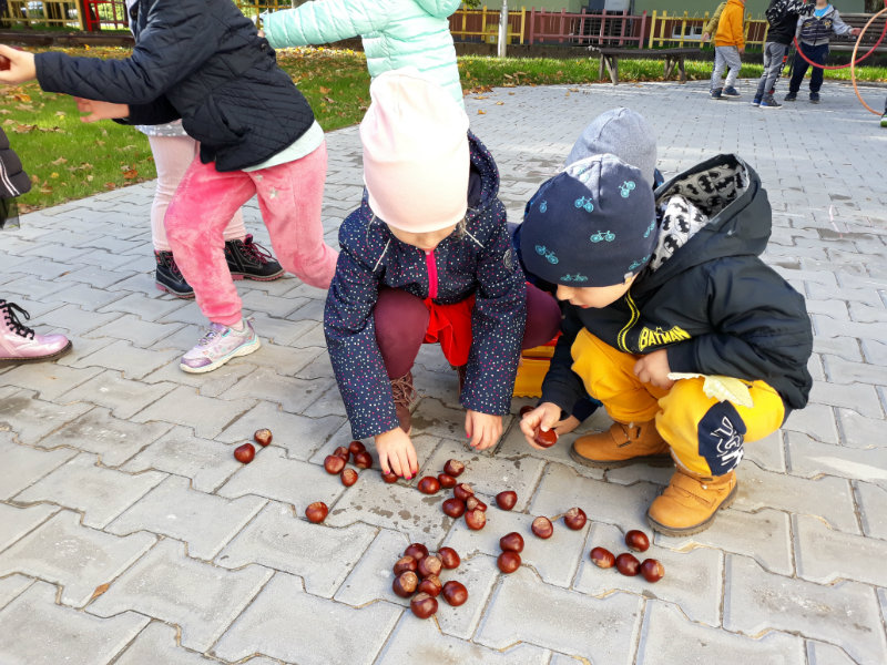 Po dažďových studených dňoch deti využili krásne jesenné počasie na školskom dvore, kde mali možnosť tvoriť rôzne obrazce z prírodnín ("na záver sme si opekali..."), športovo sa vyžili, utužovali svoje zdravie, odvážne preliezali i súťažili.