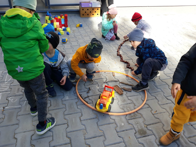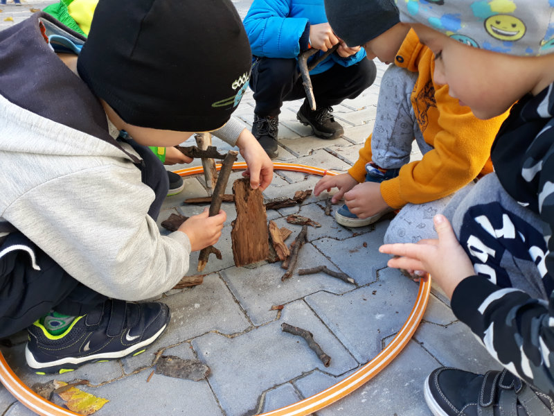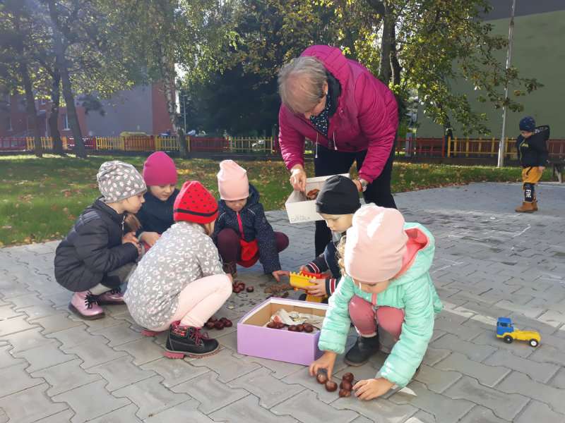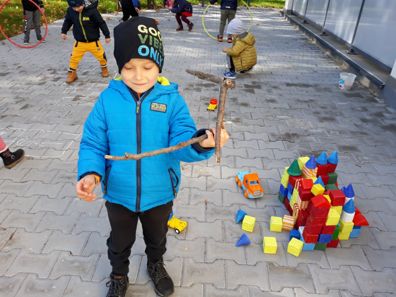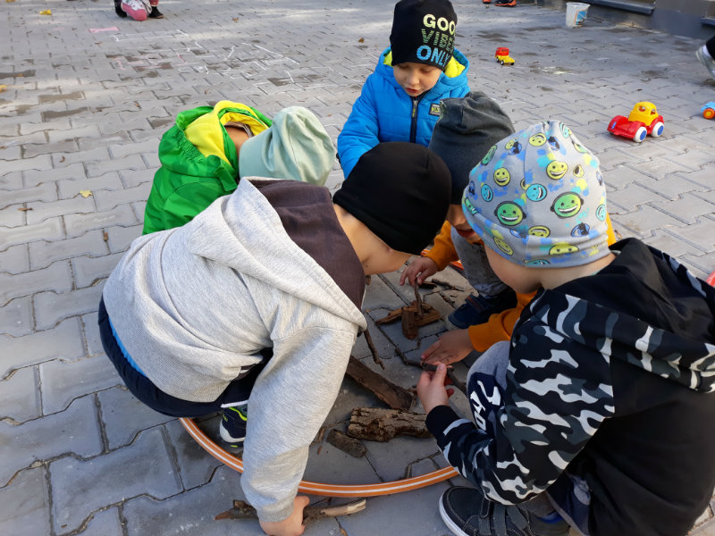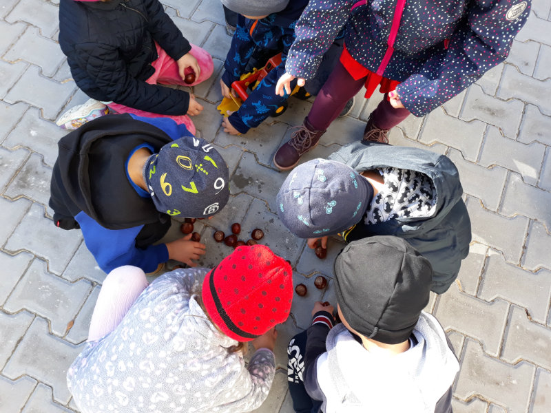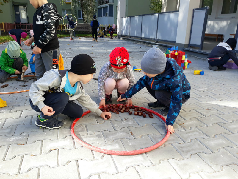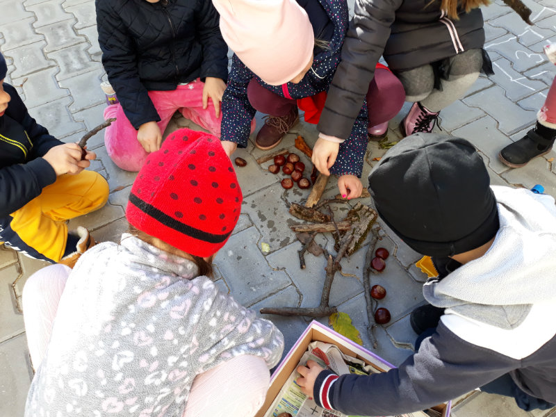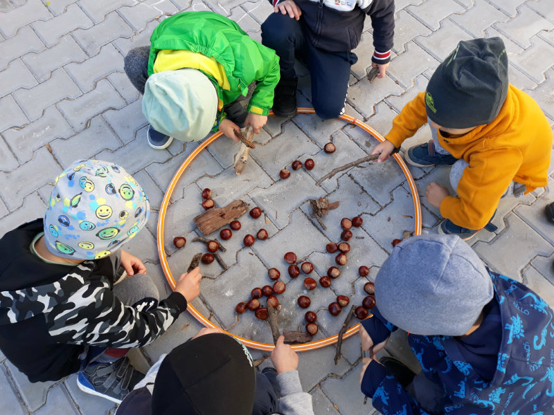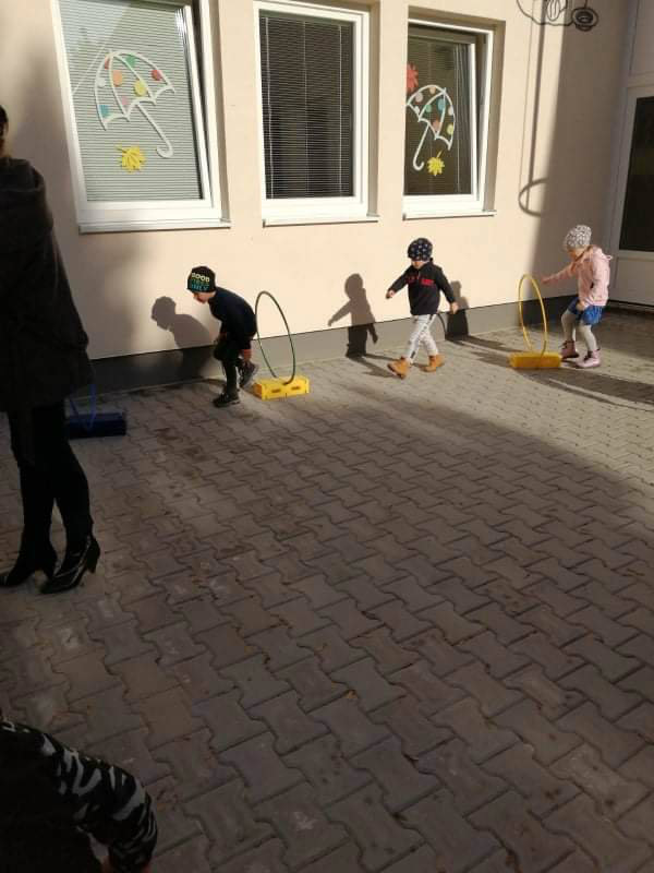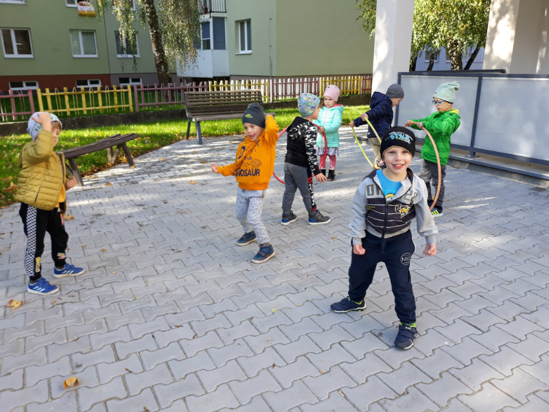 Po dažďových studených dňoch deti využili krásne jesenné počasie na školskom dvore, kde mali možnosť tvoriť rôzne obrazce z prírodnín ("na záver sme si opekali..."), športovo sa vyžili, utužovali svoje zdravie, odvážne preliezali i súťažili.