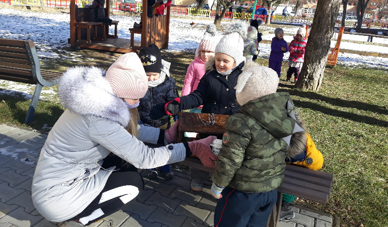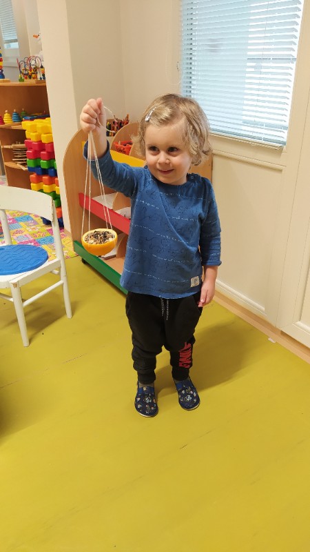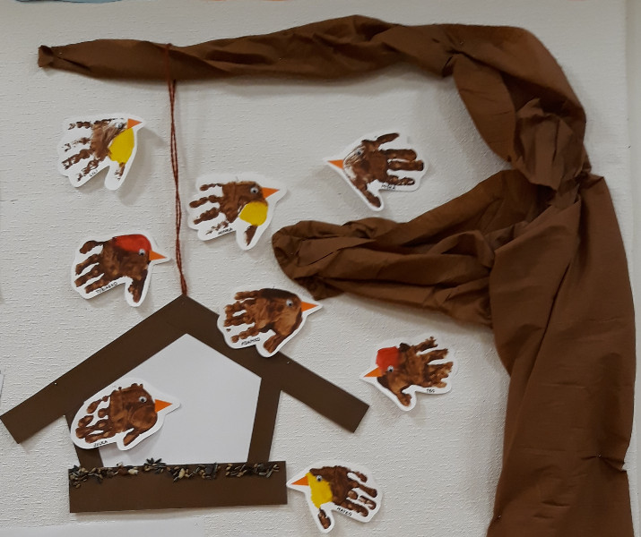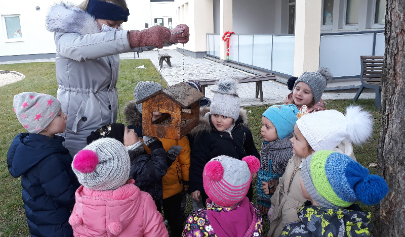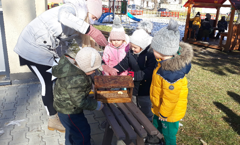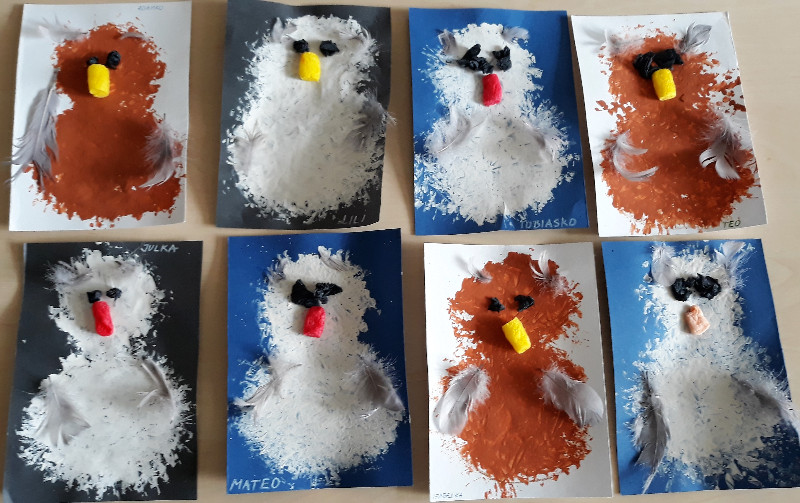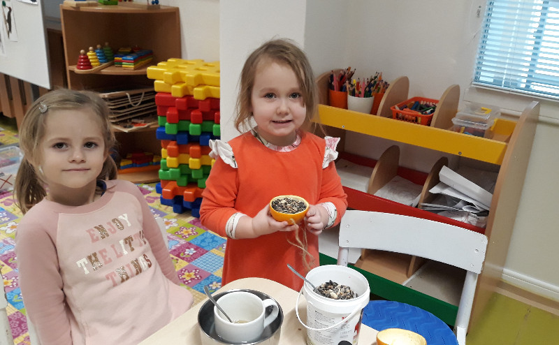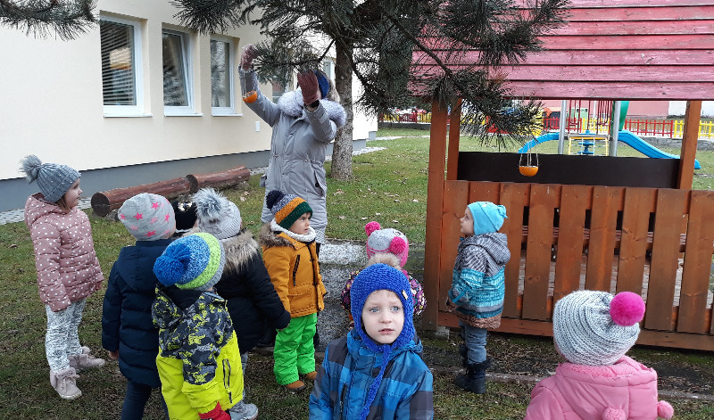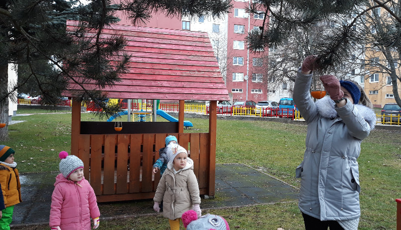 Teraz v zime deti vedia, že vtáčiky sú na tom zle a preto sme sa rozhodli urobiť kŕmidlá zo šupiek pomarančov. S pomocou p. učiteľky deti nasypali slnečnicové semienka do pomarančových pohárikov, zaliali roztopeným tukom a pripevnili špagátiky na zavesenie. Deti mali veľkú radosť, keď sme kŕmidlá zavesili na strom na školskom dvore. Do veľkej búdky, ktorú priniesli rodičia, sme ešte vtáčikom nasypali mak, slnečnicu a iné dobroty, ktoré potrebujú.