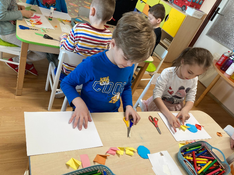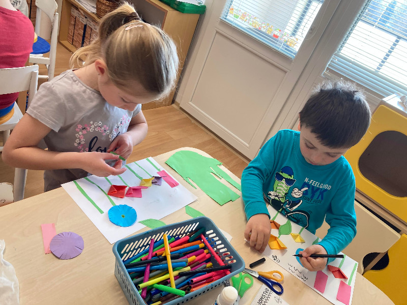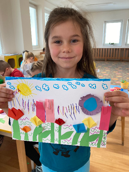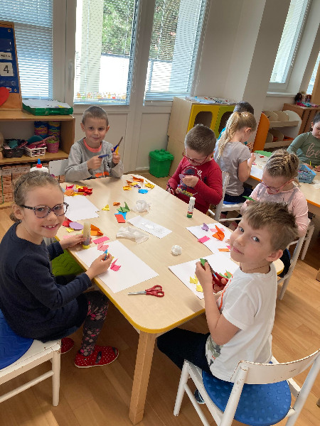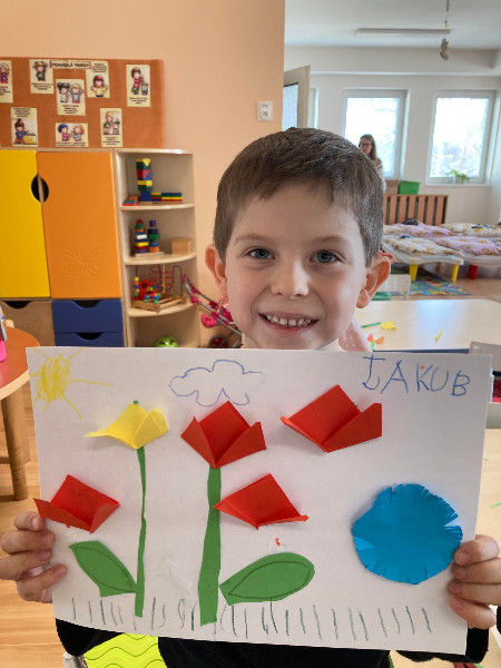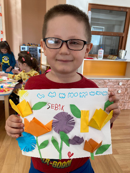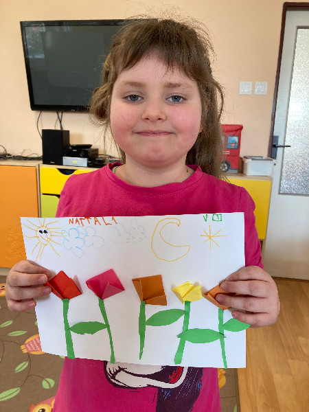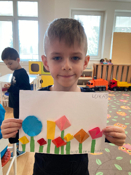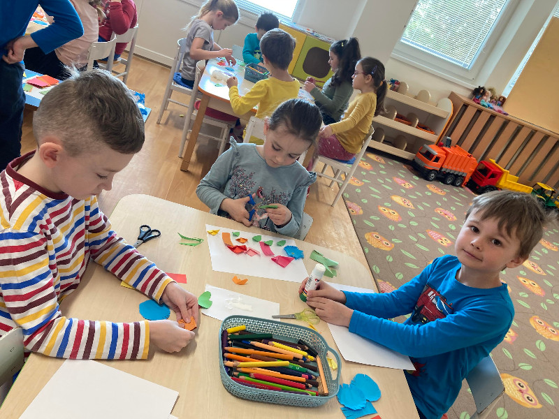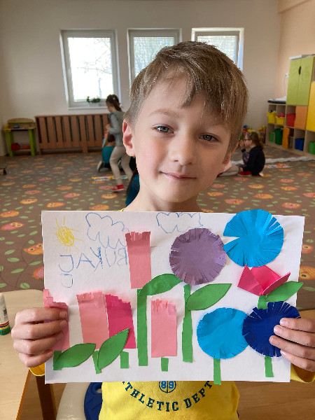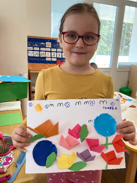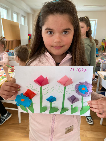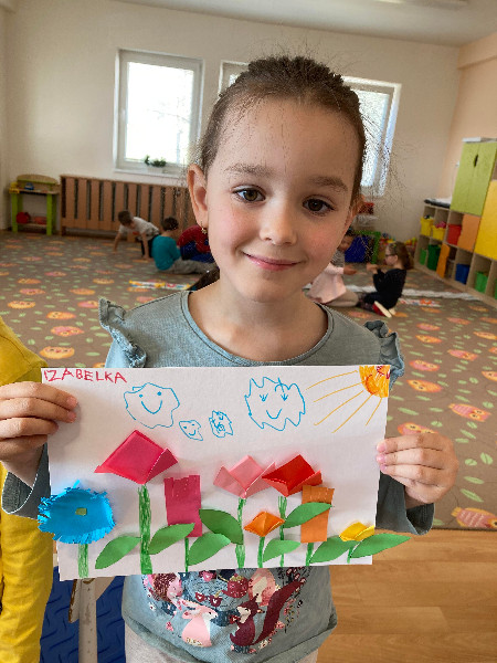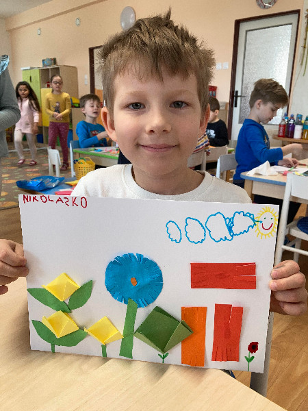 Predškoláci Usilovné včielky si precvičili jemnú i hrubú motoriku, kreativitu a prácu s farebným papierom s dodržiavaním čistoty pri práci s lepom tvorbou jarného obrazu Kvety a príroda.