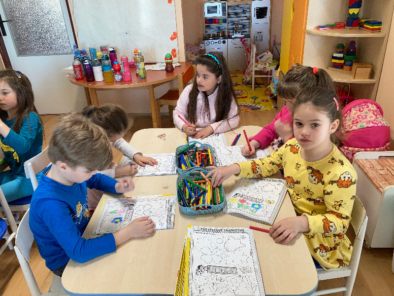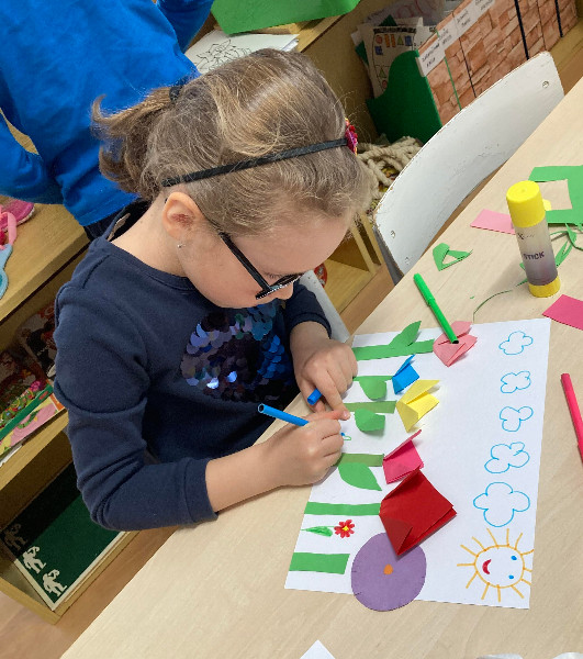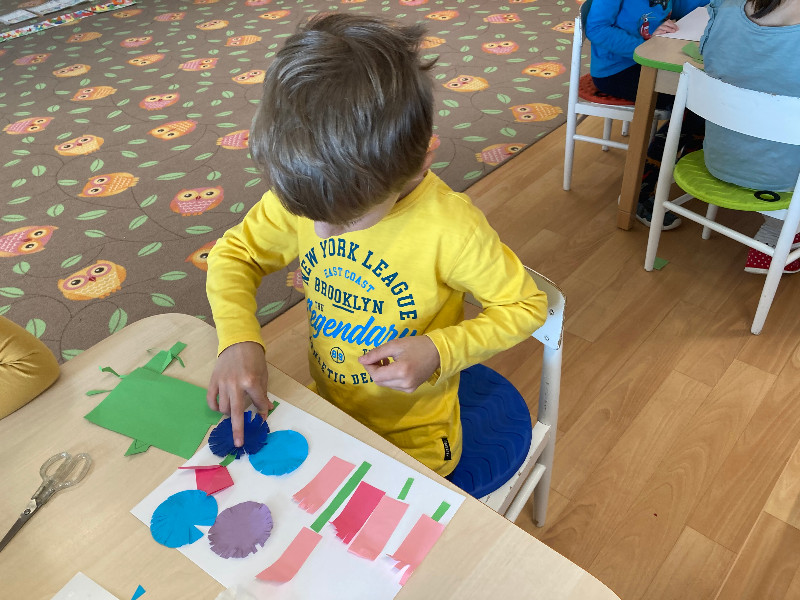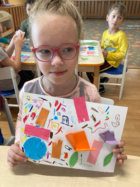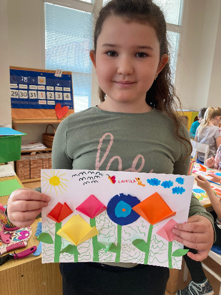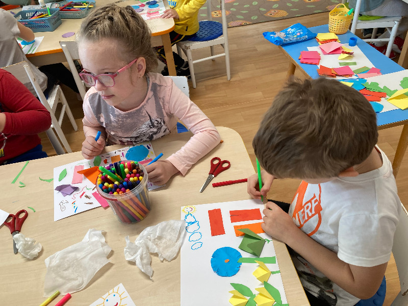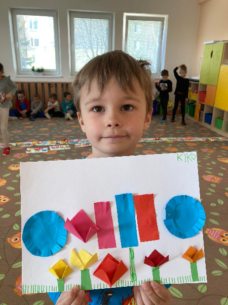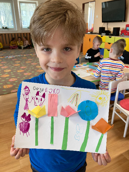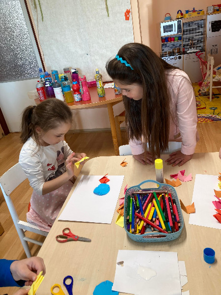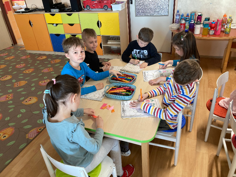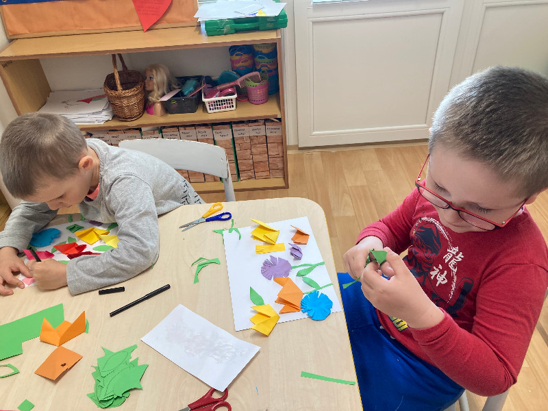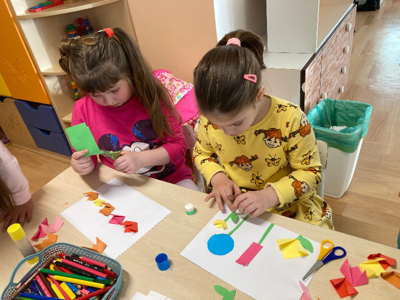 Predškoláci Usilovné včielky si precvičili jemnú i hrubú motoriku, kreativitu a prácu s farebným papierom s dodržiavaním čistoty pri práci s lepom tvorbou jarného obrazu Kvety a príroda.