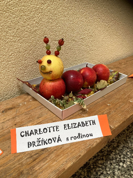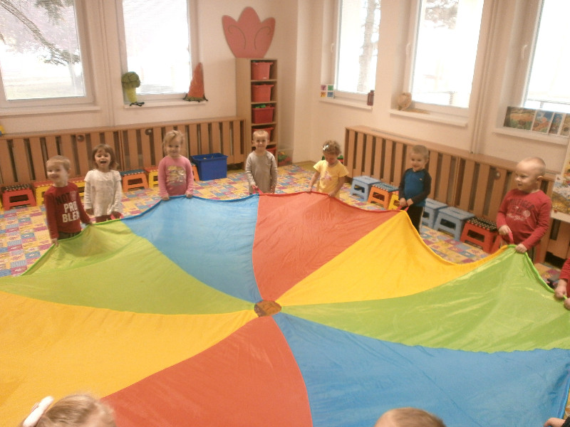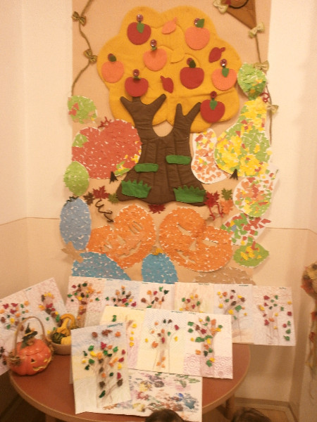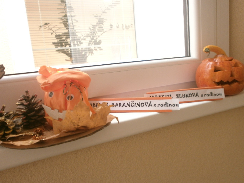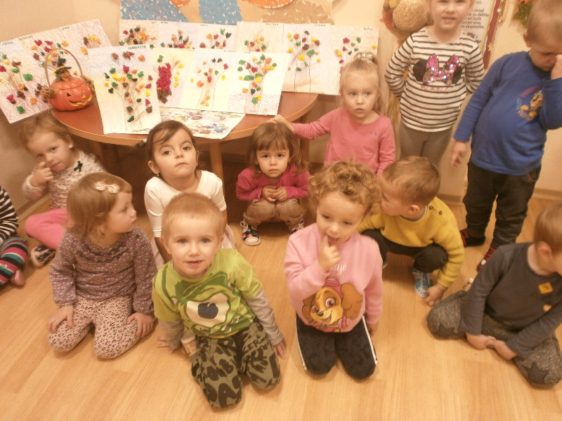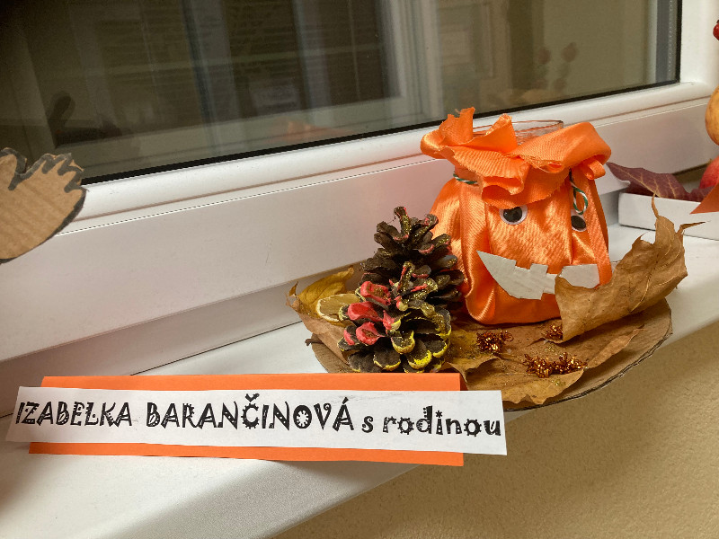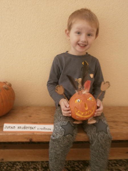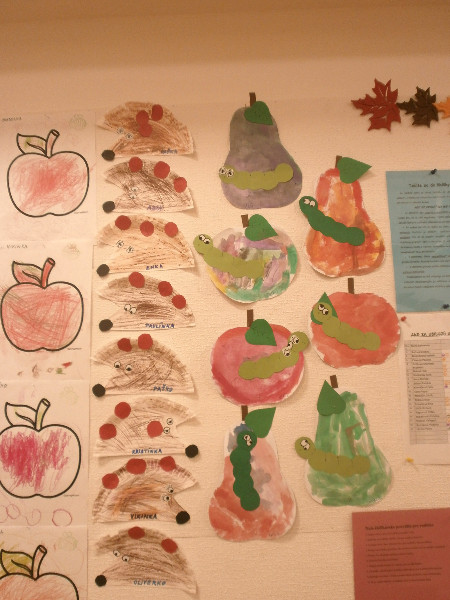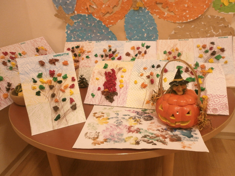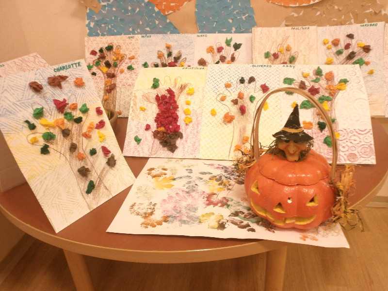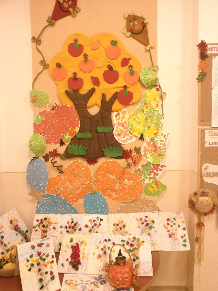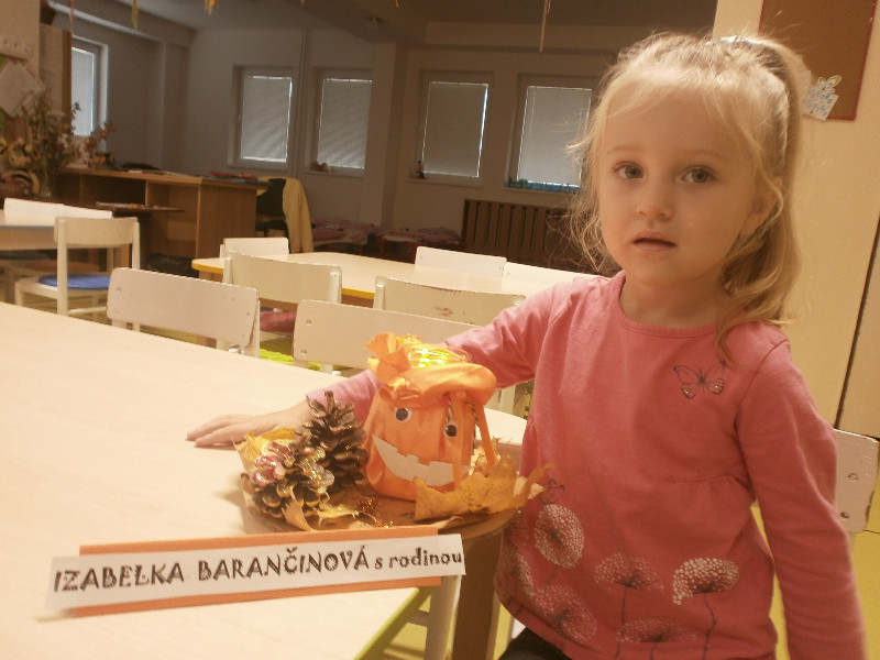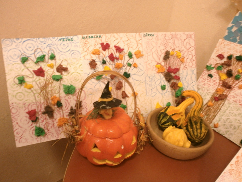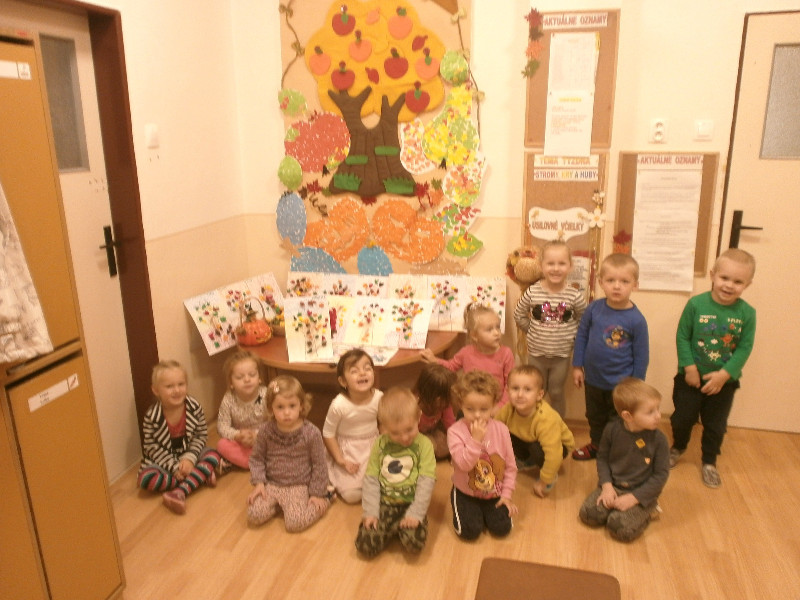 Farebný jesenný čas naši najmenší prežili veselými hrami, šantením na čerstvom vzduchu, vychádzkami s pozorovaním pani Jesene, vytváraním nových prác v oblasti výtvarných a pracovných činností s trénovaním si jemnej a hrubej motoriky, vytváraním obrysov ľudskej postavy podľa kamarátov, zábavnými hrami s padákom, vytváraním jesenných výtvorov so svojimi rodičmi.