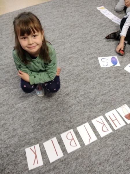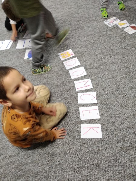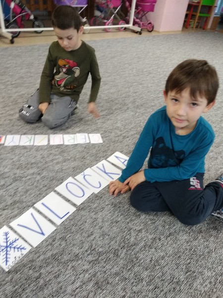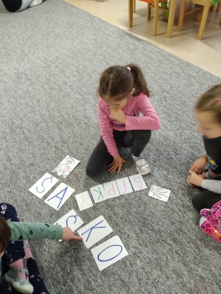 Predčitateľská gramotnosť. Deti skladajú slová z písmen podľa vzoru čítajú.