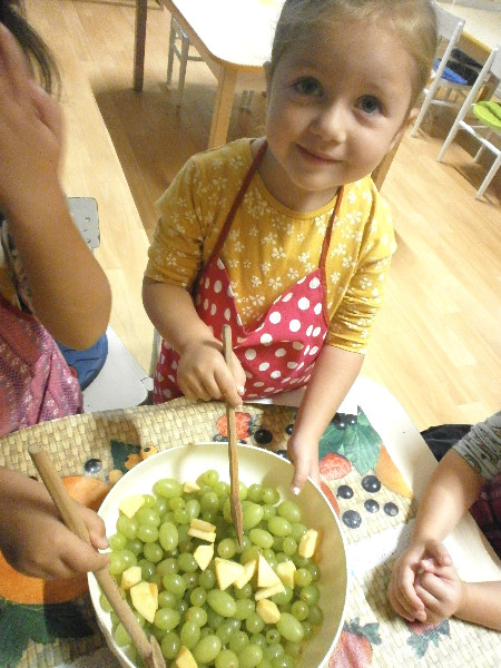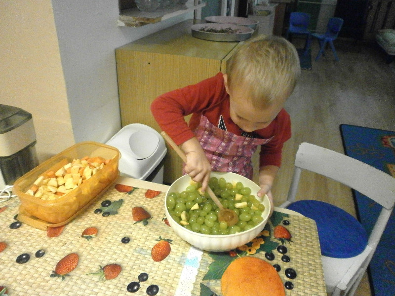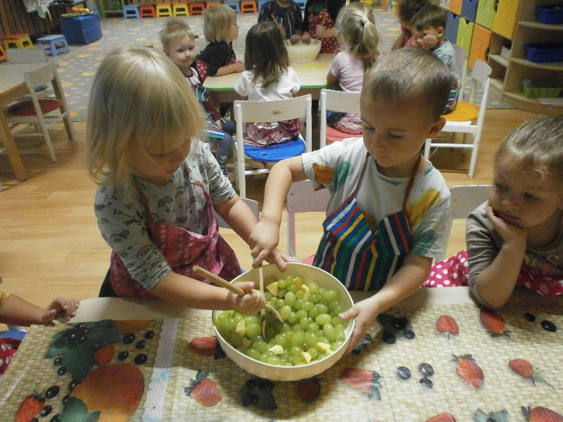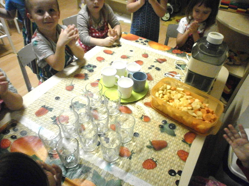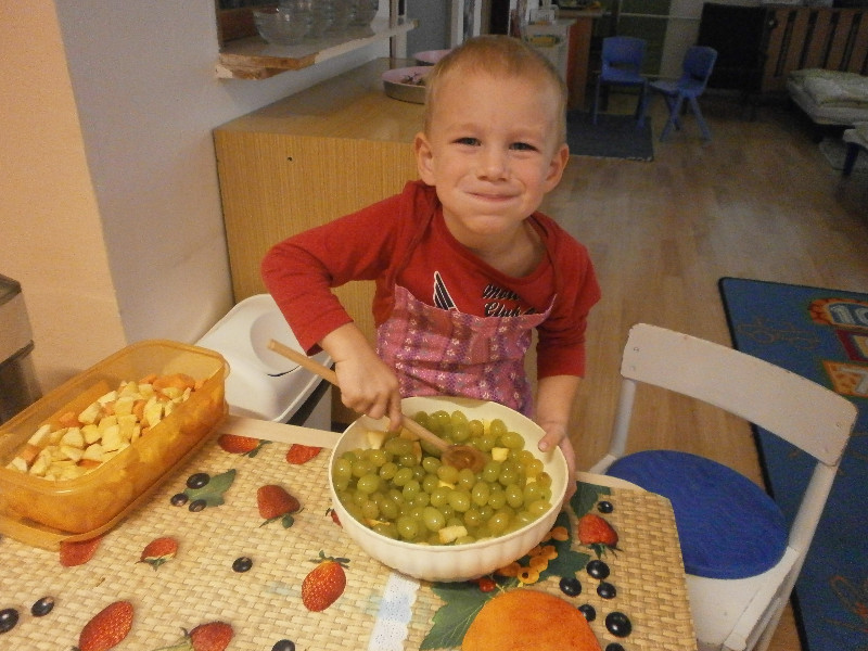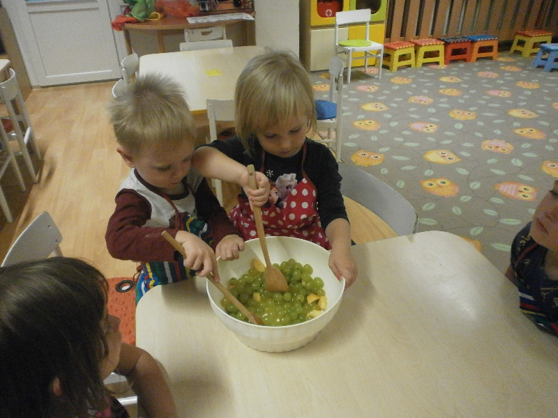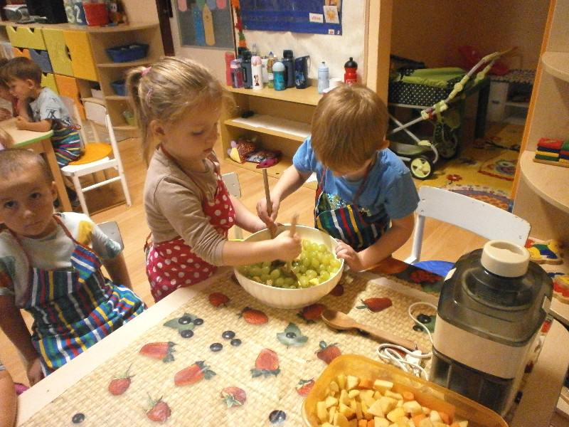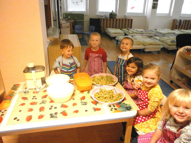 V našom Týždni zdravého stravovania prostredníctvom zážitkového učenia nám naši Malí kuchári pripravili zdravý ovocný šalátik a s pomocou pani učiteľky i mrkvovo-jablkovú šťavu. Všetko riadne natrhali, umyli, premiešali, naservírovali a pre svoje zdravé brušká všetko s chuťou zjedli.