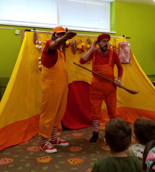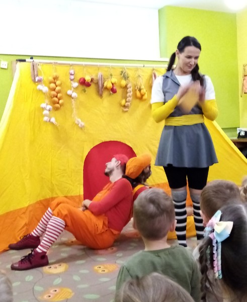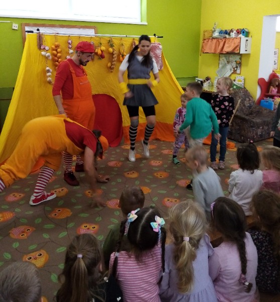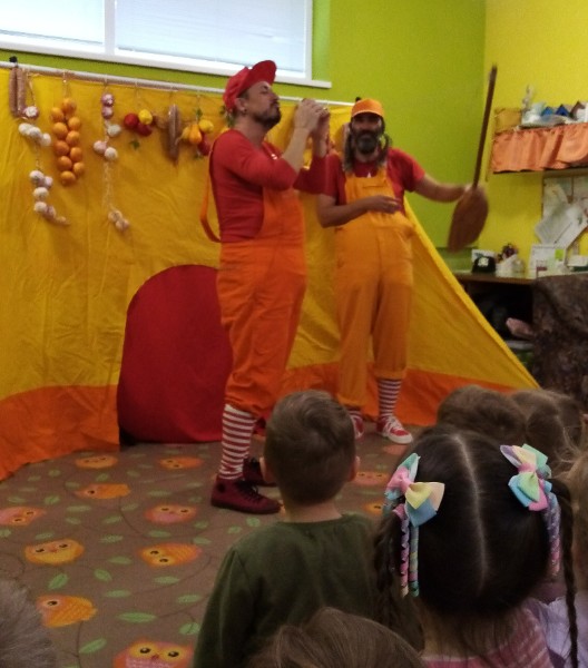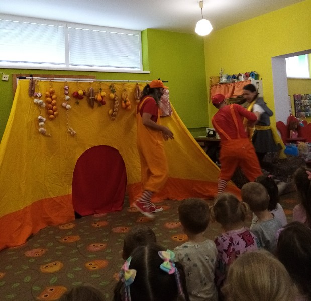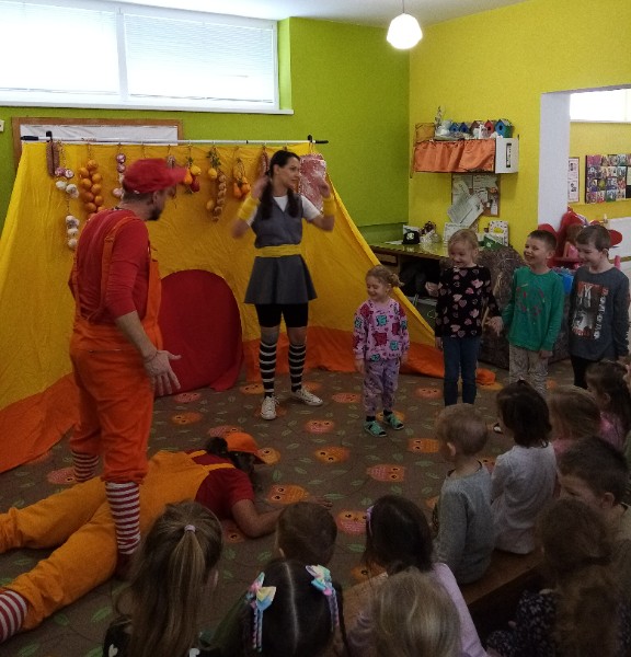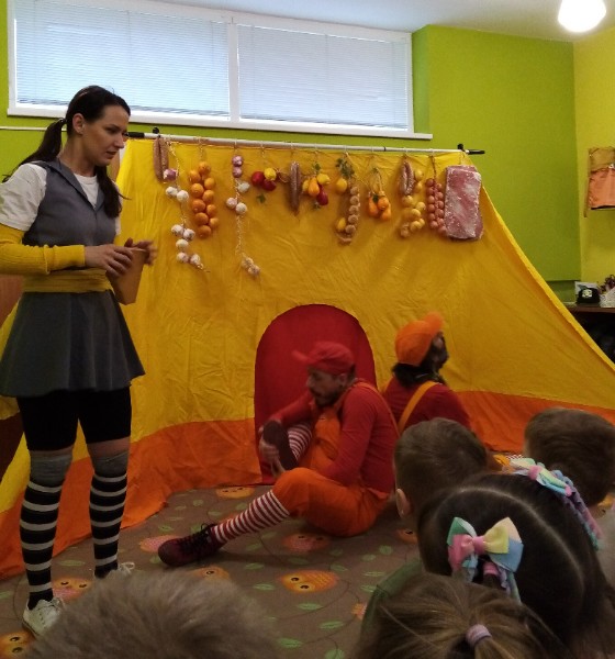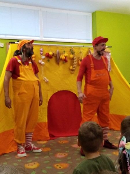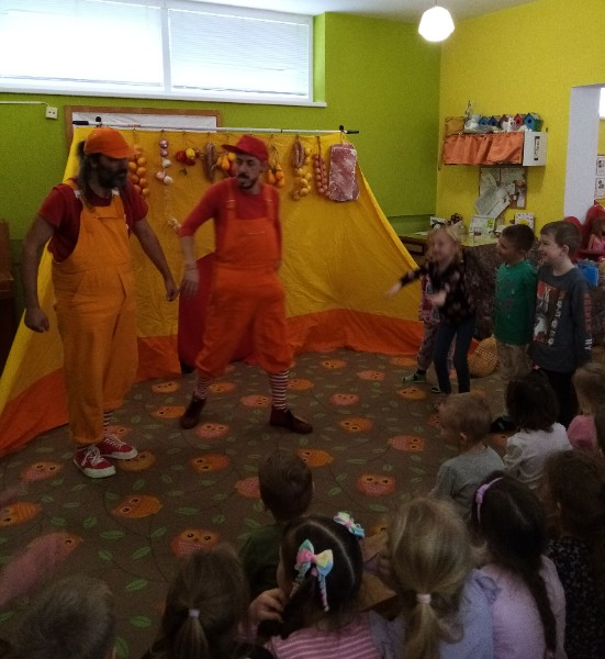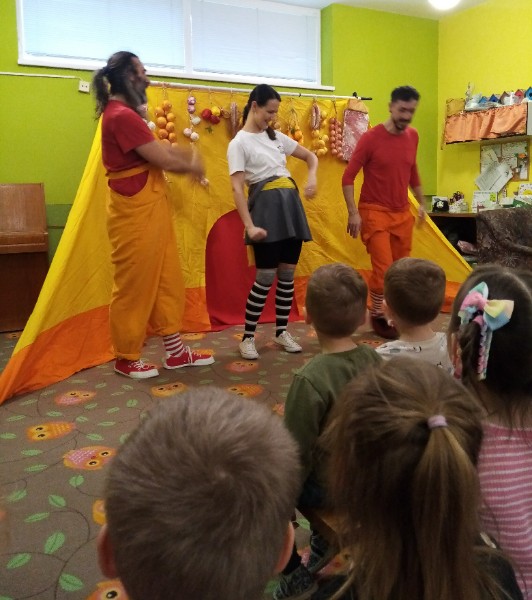 13.3.2025 bolo u nás veselo. Zavítalo k nám Divadlo Na traky s rozprávkou Dvaja leniví kocúri a myš.